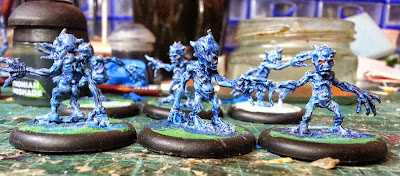 This is the rest of the Rasputina Malifaux band including the eponymous hero herself. I think it's the hero figure that I like the least. You have to wonder waht they were thinking of when they had the design meeting (which must happen a lot in design meetings). There are a lot of little Ice Gamin (which is apparently not a type of sat nav but a small ice spirit). The Gamin should fit nicely with the winter theme of the Skyrim game. They all come of those round lipped bases which I hate. These are much bigger than the usual 25mm/1" which makes them fun on gridded tabletops. Without them they don't work for Malifaux. Aside from the boss I have ideas for all the others. I suspect the boss is going to end as a workbench warmer. Mind you I have enough of them already I should be able to grow tomatoes in the work room.